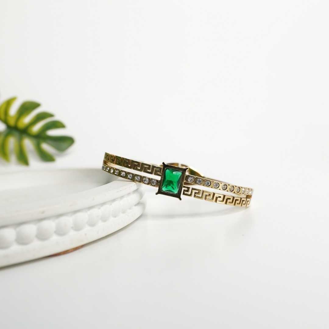 Regular price Rs. 1,299.00Sale price Rs. 1,299.00 Regular price Rs. 1,999.00Unit price / perDescription: Sleek. Chic. Effortless. The Emerald Luxe Bangle is designed for the modern minimalist who loves a hint of luxury. Crafted in 18K gold-plated stainless...
