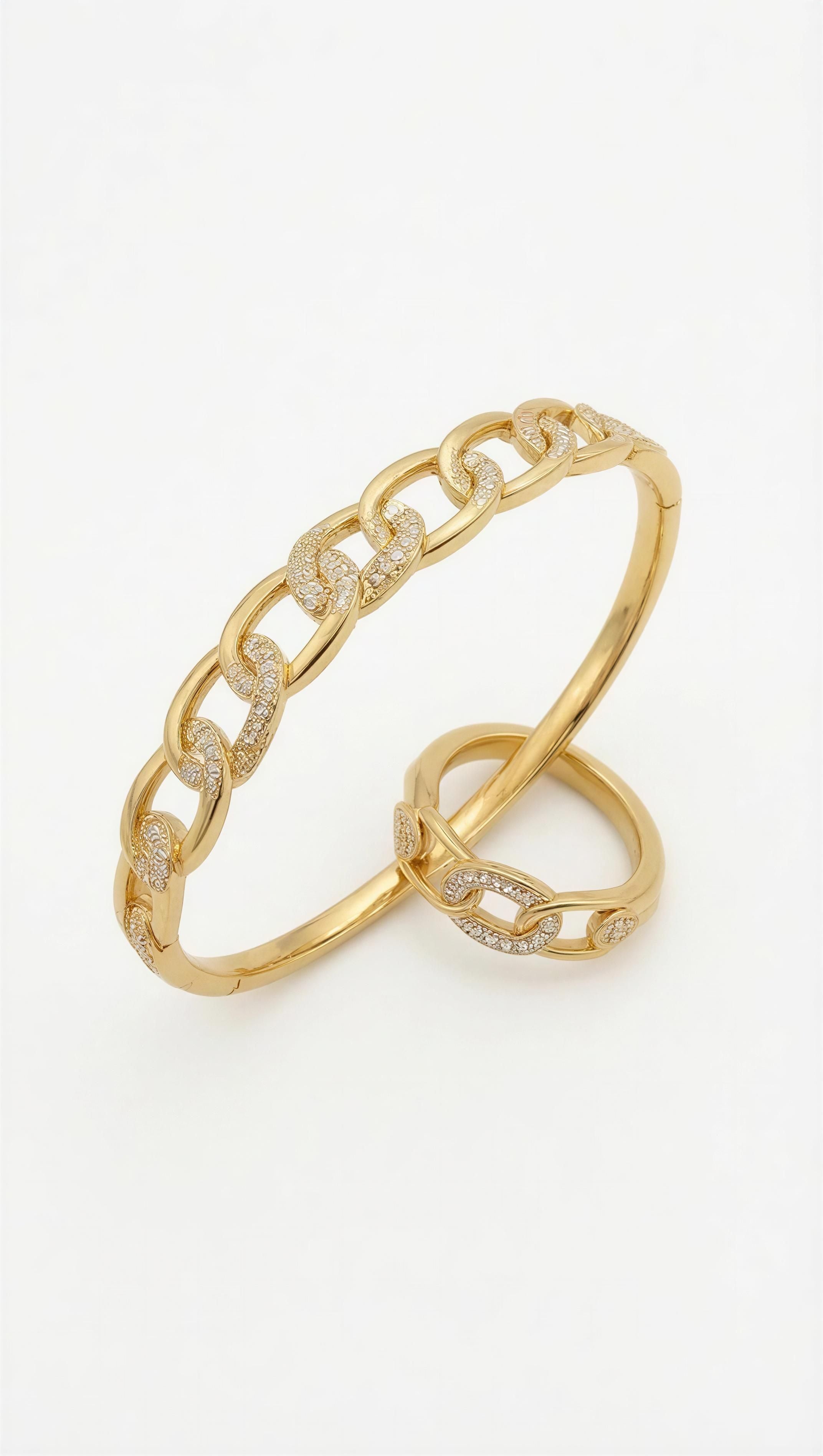Regular price Rs. 1,499.00Sale price Rs. 1,499.00 Regular price Rs. 2,999.00Unit price / perMake a statement without saying a word. The Verona Luxe Set features a striking gold-toned bracelet and matching ring, crafted from high-quality stainless steel and...