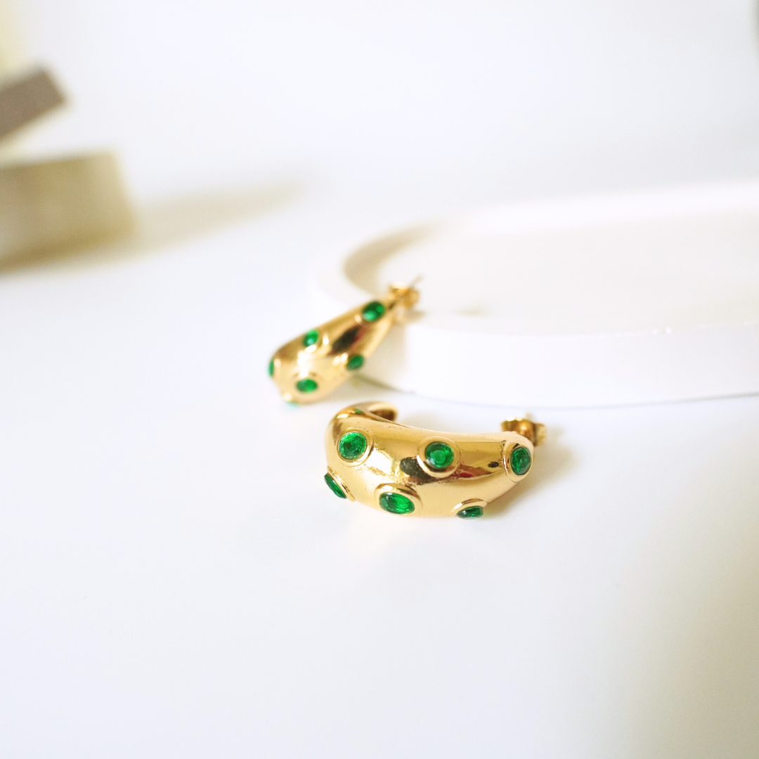 Regular price Rs. 999.00Sale price Rs. 999.00 Regular price Rs. 1,799.00Unit price perWhere bold meets brilliance. Emerald Glaze Hoops are crafted from anti-tarnish stainless steel, plated in luxurious 18K gold, and studded with vivid emerald-toned stones. Lightweight, waterproof,...