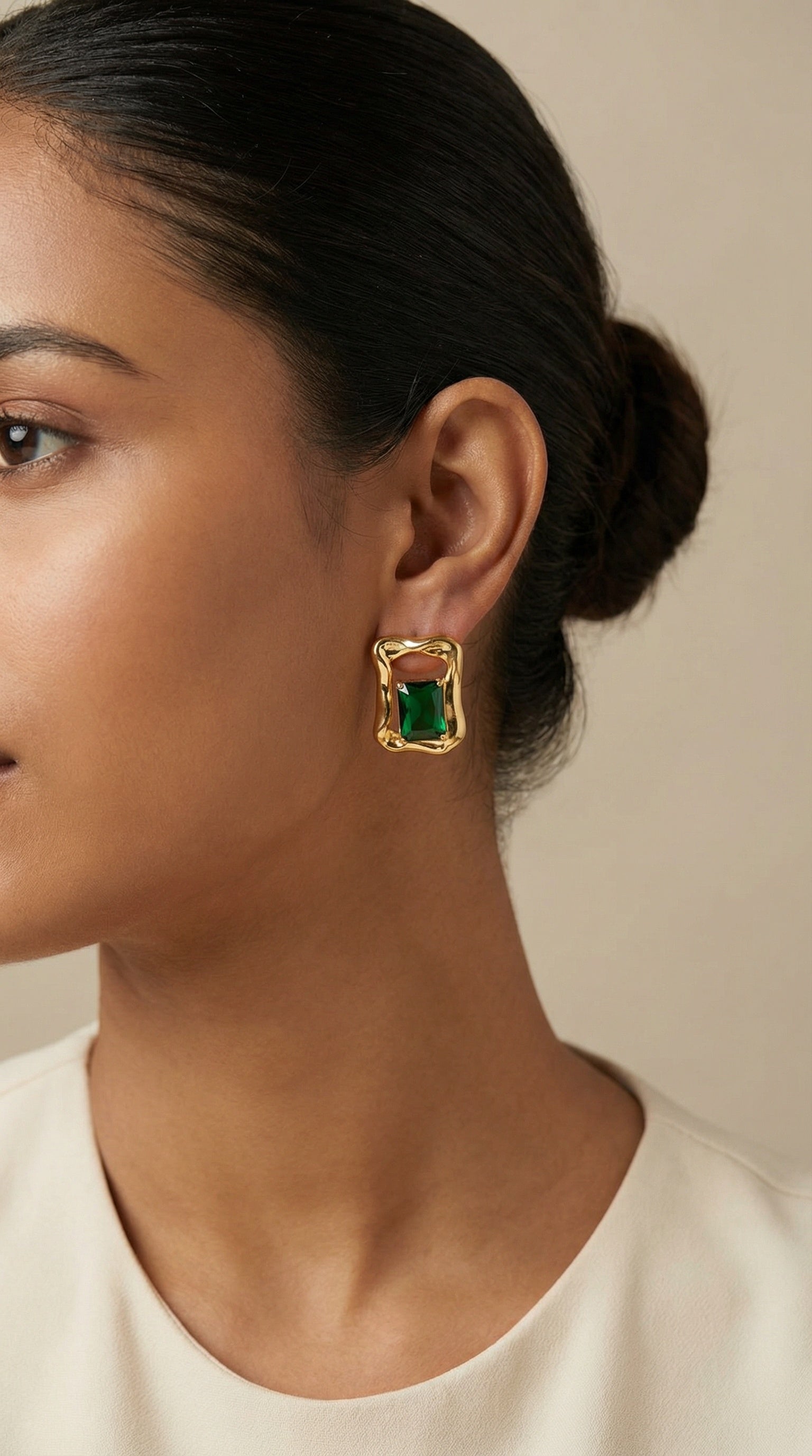 Add a touch of timeless elegance to your jewelry collection with our Verde Aura Emerald Stud Earrings. Featuring a rich emerald-green stone set in a softly...