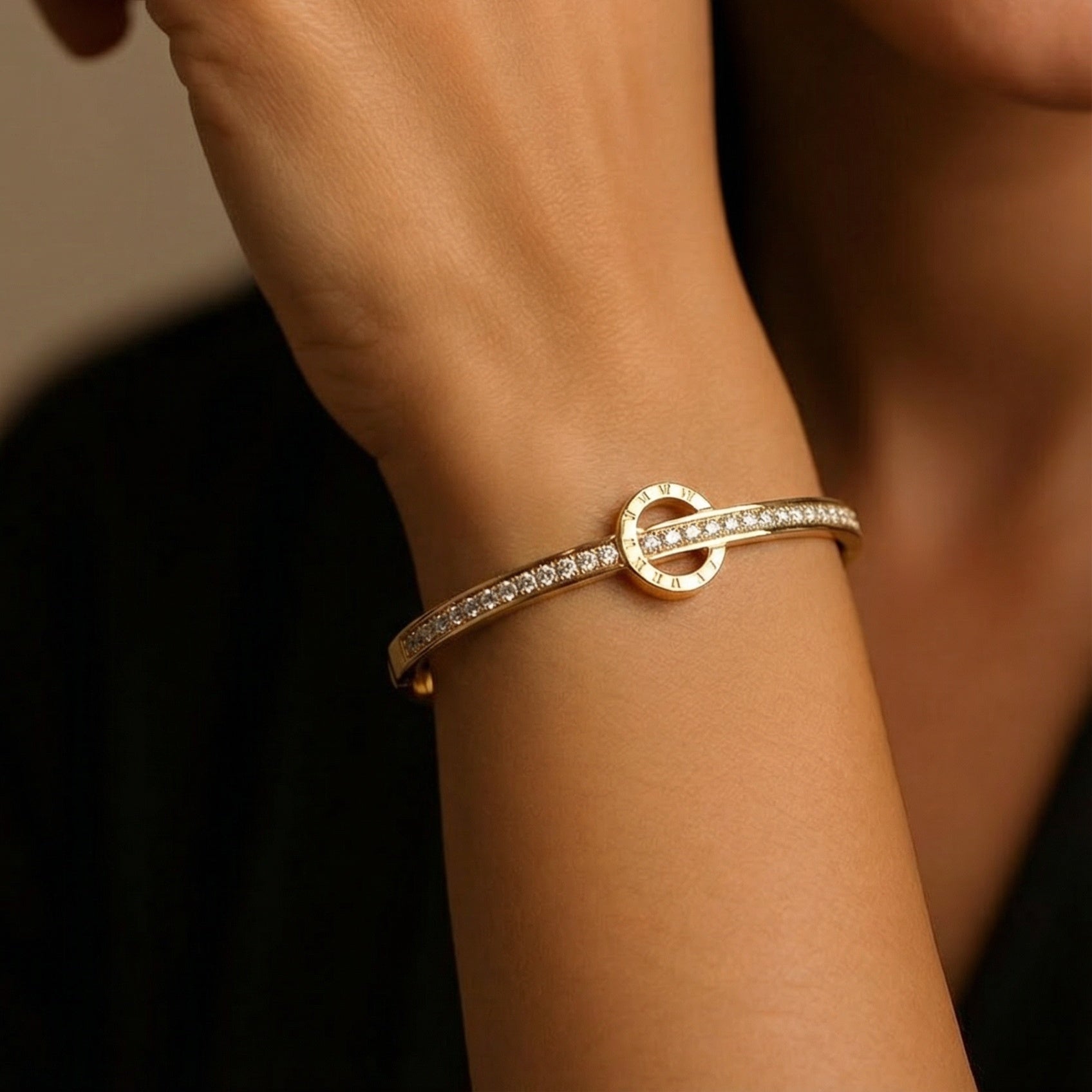 Understated brilliance meets timeless design.   The Aurelia Roman Halo Bracelet features a sleek 18K gold-plated band lined with delicate crystal detailing, intersected by a signature...