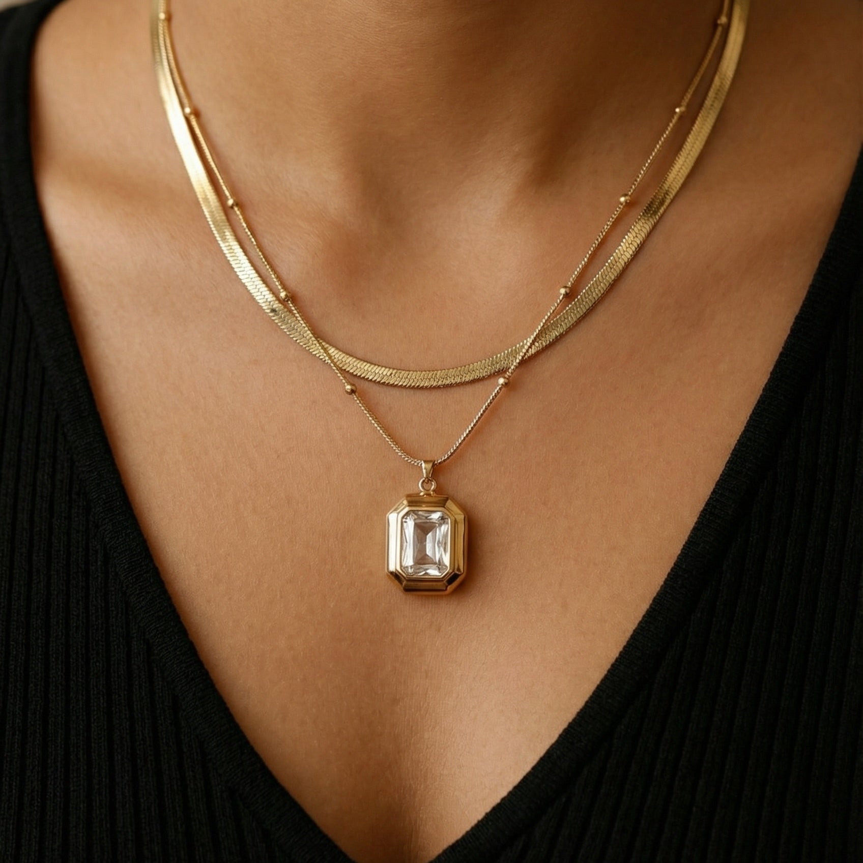 Regular price Rs. 1,099.00Sale price Rs. 1,099.00 Regular price Rs. 1,999.00Unit price / perMinimal yet striking, the Lumière Edge Layered Necklace brings together sleek layered chains and a bold emerald-cut solitaire pendant for a modern, elevated look. Designed for...