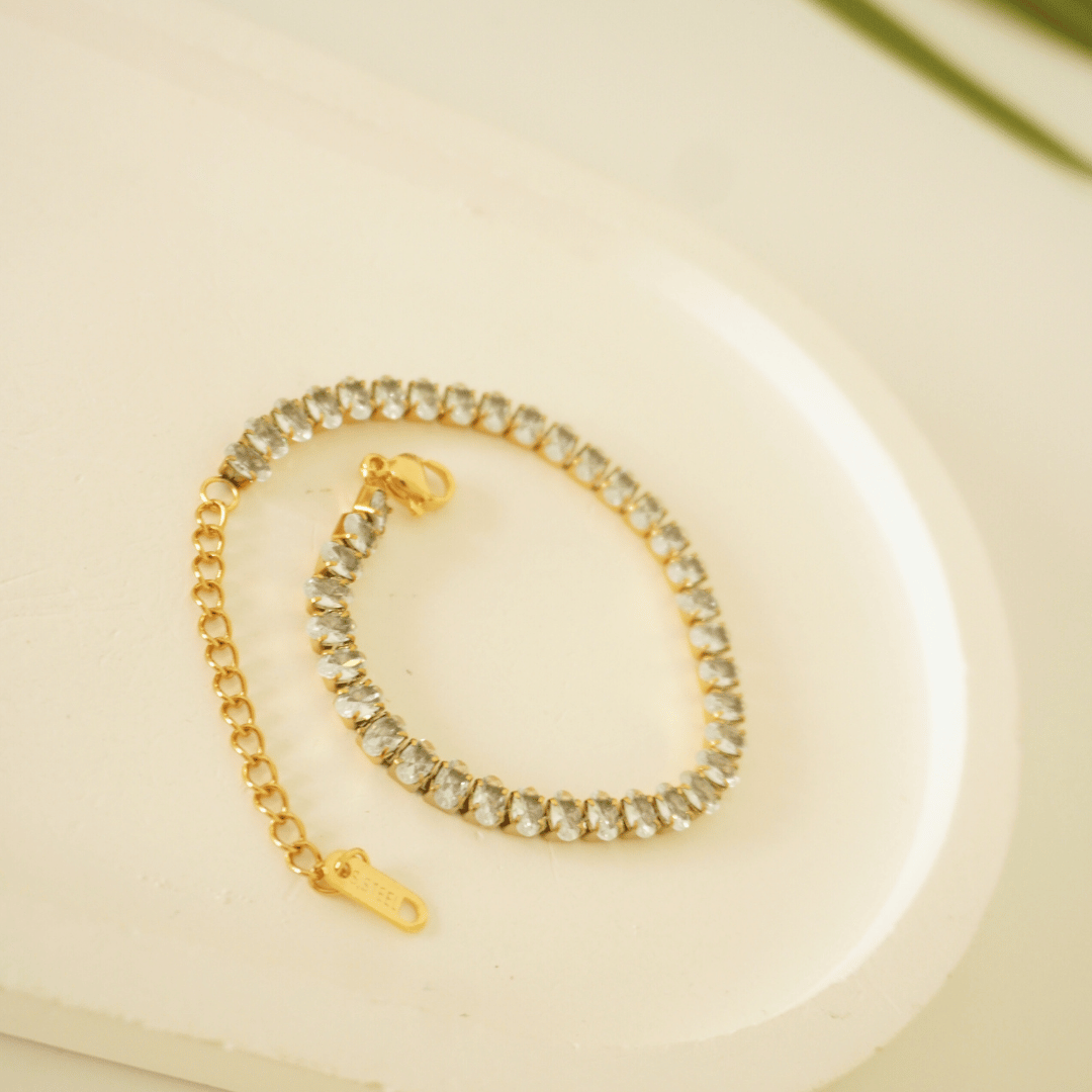 Meet the Alaya Oval Tennis Bracelet—a refined blend of elegance and timeless sparkle. Designed with oval-shaped CZ stones set in premium stainless steel and finished with 18K gold plating, this bracelet is a perfect balance of sophistication and everyday versatility.