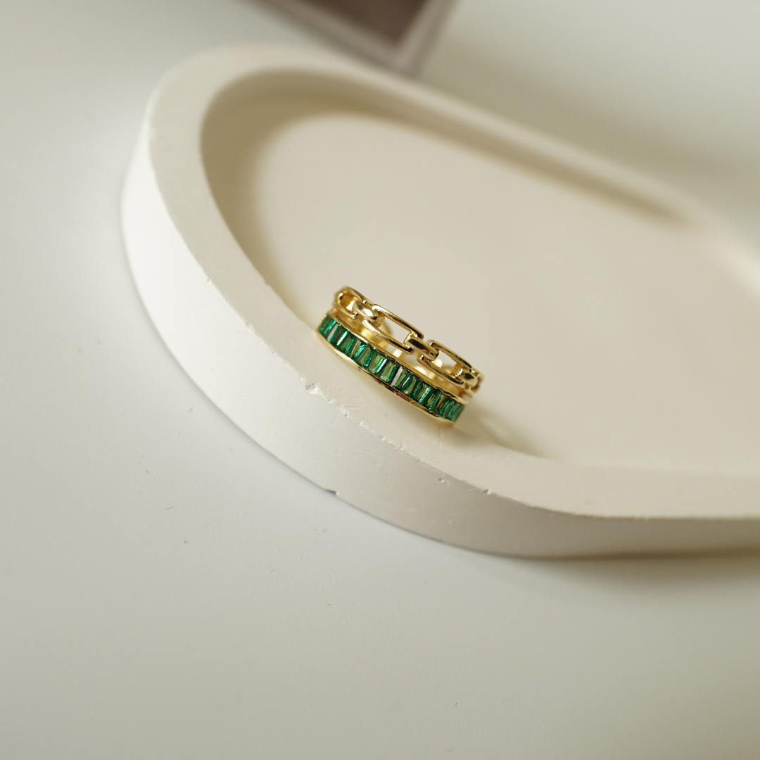 Make a bold yet elegant statement with our Emerald Glaze Duo Band Ring. Featuring a unique stacked look with rich green baguette stones and a sleek gold-plated chain link design, this ring is the perfect mix of edgy and classy. Whether you’re dressing up for an occasion or adding a pop to your everyday look, this piece turns heads effortlessly.
