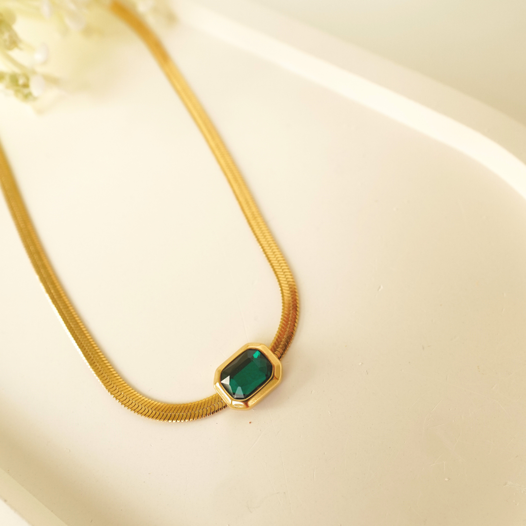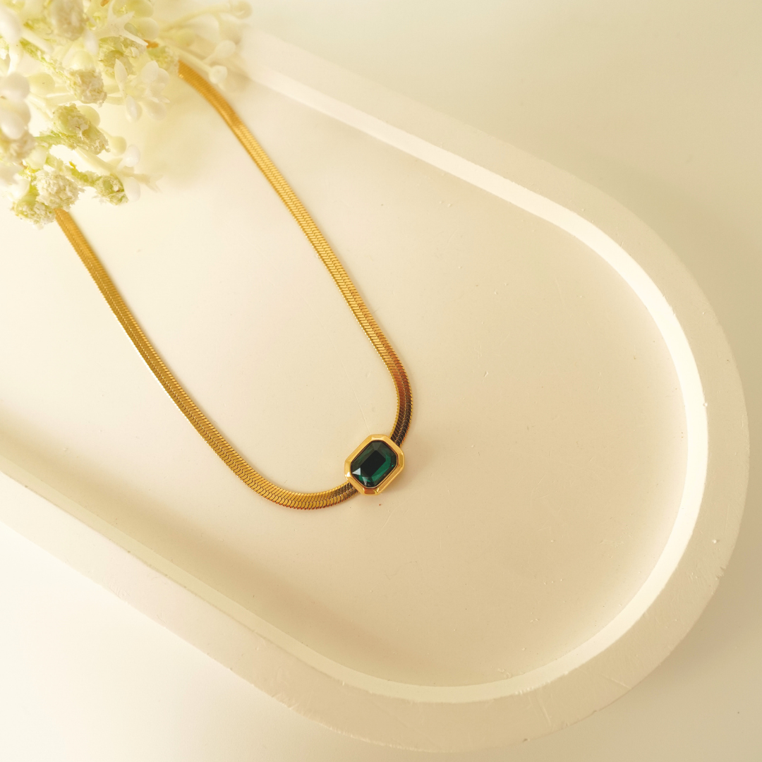 Make a bold and elegant statement with the Ashara Emerald Radiance Necklace. This necklace features a deep green, emerald-cut stone set in a sleek gold bezel, resting on a flat herringbone chain that sits beautifully on the collarbone. The luxe green and gold combo is a timeless classic – perfect for festive glam, special occasions, or elevating your everyday look.