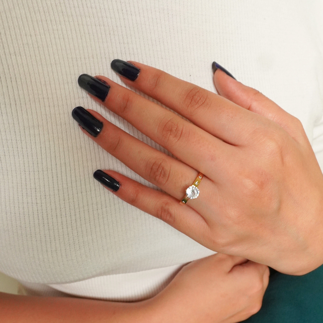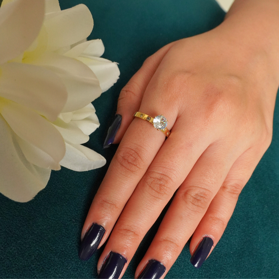 A timeless symbol of elegance — the Eternal Glow Solitaire Ring is crafted in radiant 18K gold-plated stainless steel, featuring a dazzling round-cut center stone surrounded by delicately embedded cubic zirconia along the band. Waterproof, anti-tarnish, and made for your forever moments — this ring is perfect for proposals, promises, or pampering yourself.
