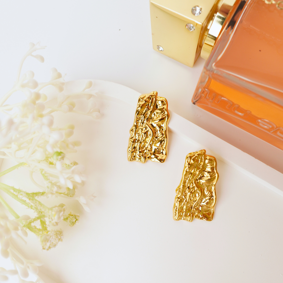 These statement-making gold studs blend rugged texture with modern elegance, perfect for those who appreciate artistic minimalism. Lightweight and wearable, they are a sculptural upgrade to your daily accessories.