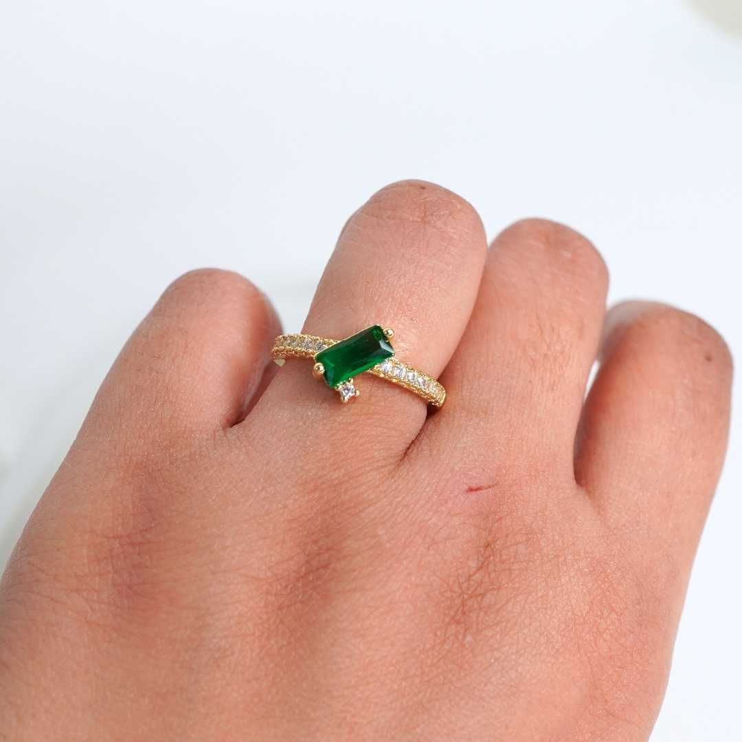 This stunning piece features a bold emerald-green baguette-cut stone, complemented by a sparkling band of delicate crystals. The 18K gold-plated adjustable band ensures comfort, style, and versatility, making it the perfect blend of luxury and everyday wear.
