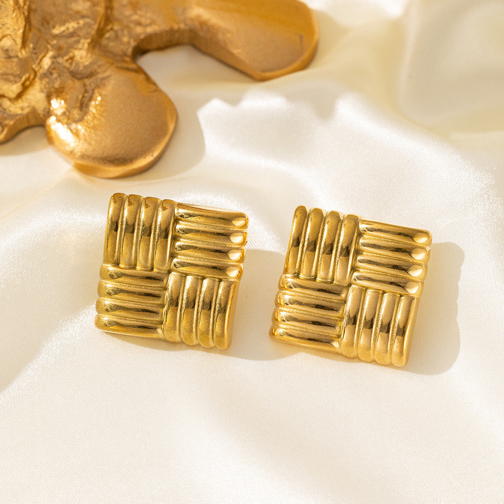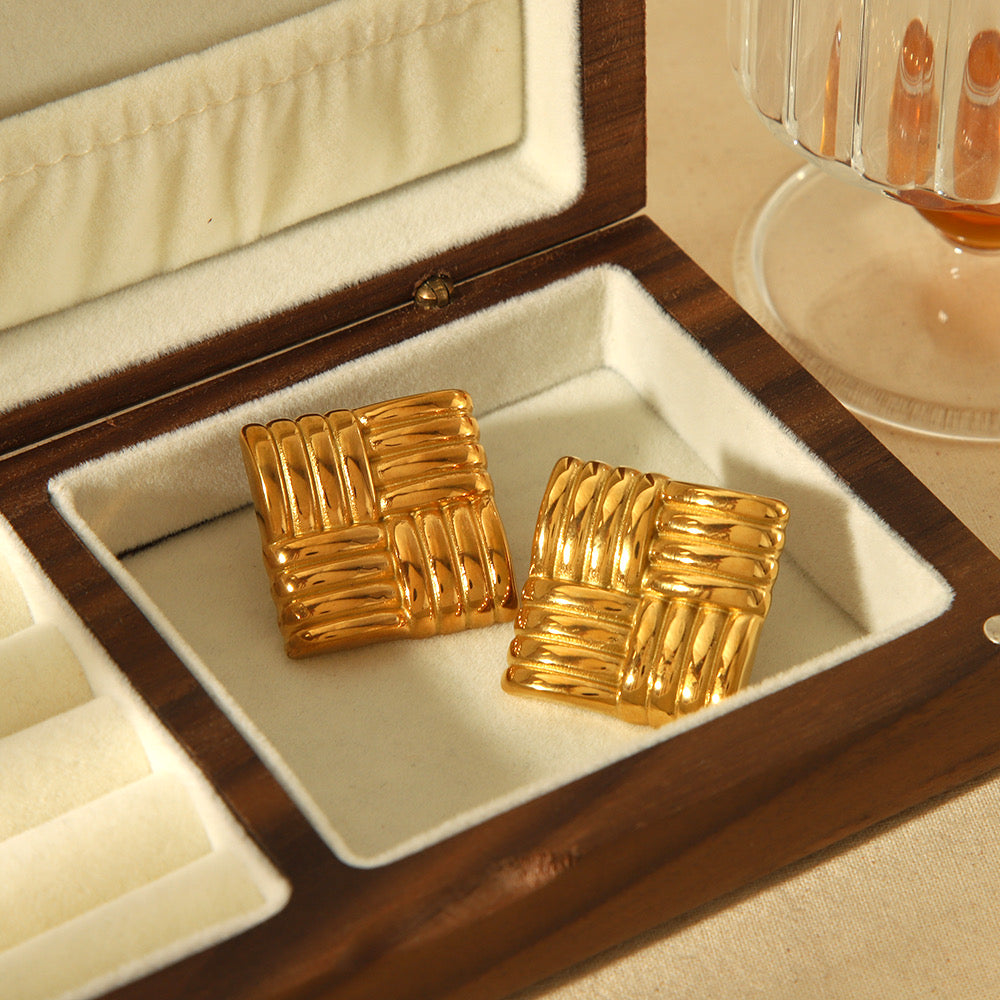 Add a touch of bold elegance with the Aurora Woven Square Studs. Crafted from premium stainless steel and finished with luxurious 18K gold plating, these geometric earrings feature a unique woven design that blends minimalism with statement style. Lightweight and comfortable, they’re perfect for both everyday wear and special occasions.