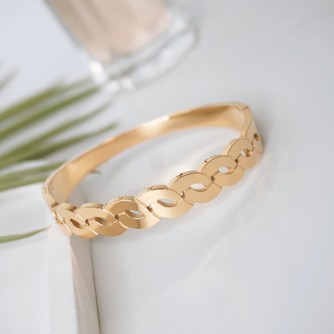 Make a powerful statement with the Bold Link Luxe Bangle, inspired by classic chain-link patterns reimagined in a sleek, modern design. Crafted with premium 18K gold plating, this bangle offers both durability and elegance, making it a must-have for every jewelry collection.