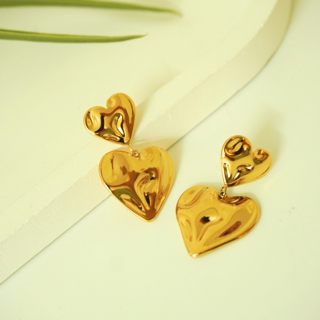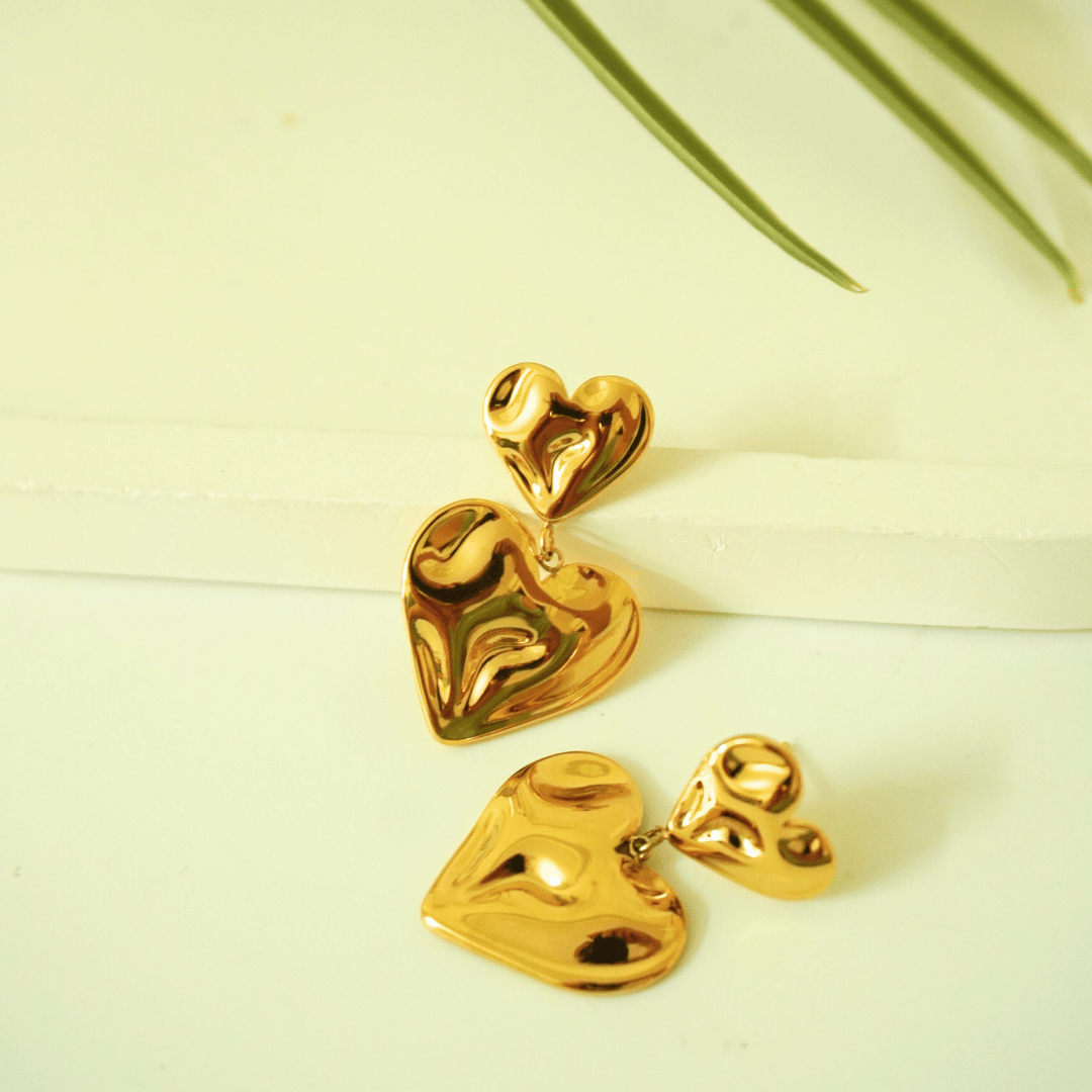 Romantic with a modern twist, the Celeste Double Heart Earrings feature two sculpted hearts linked together, creating a playful yet elegant drop design. Crafted from premium stainless steel and finished with radiant 18K gold plating, these earrings catch the light beautifully with their fluid, molten-like texture.
