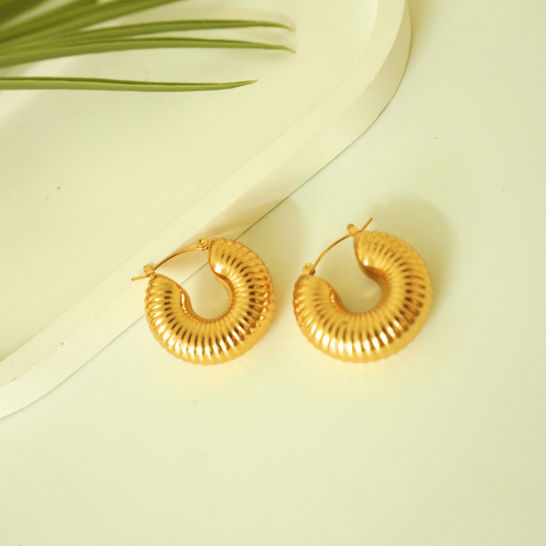 Chic and timeless, the Cleo Ribbed Hoop Earrings feature a bold rounded silhouette with a ribbed texture that catches the light beautifully. Crafted from premium stainless steel and coated with rich 18K gold plating, these hoops are the perfect everyday statement piece.