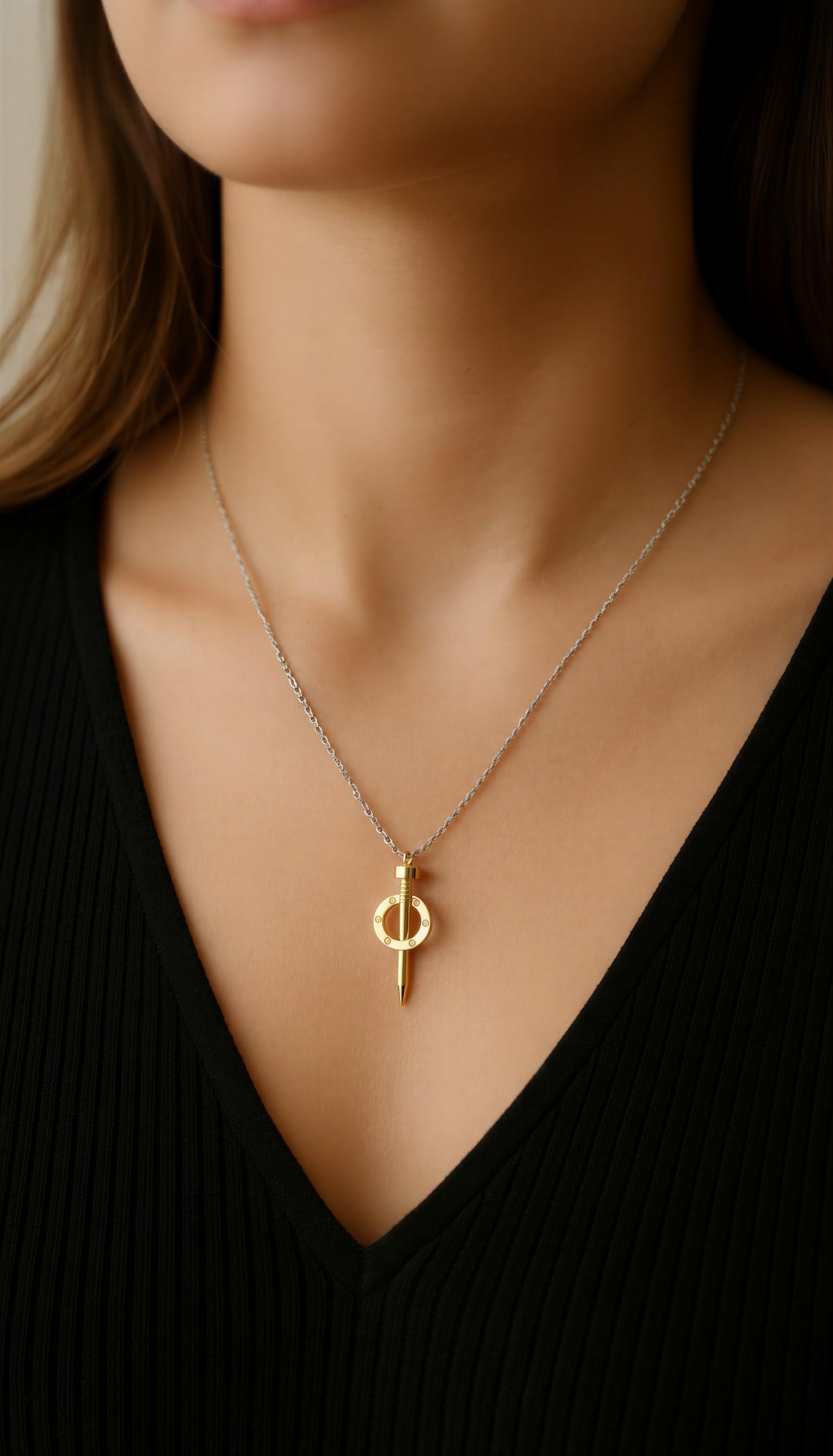 Edgy, sleek, and effortlessly stylish — the Dual-Tone Screw Drop Necklace is designed for women who love modern minimalism with a touch of bold elegance.