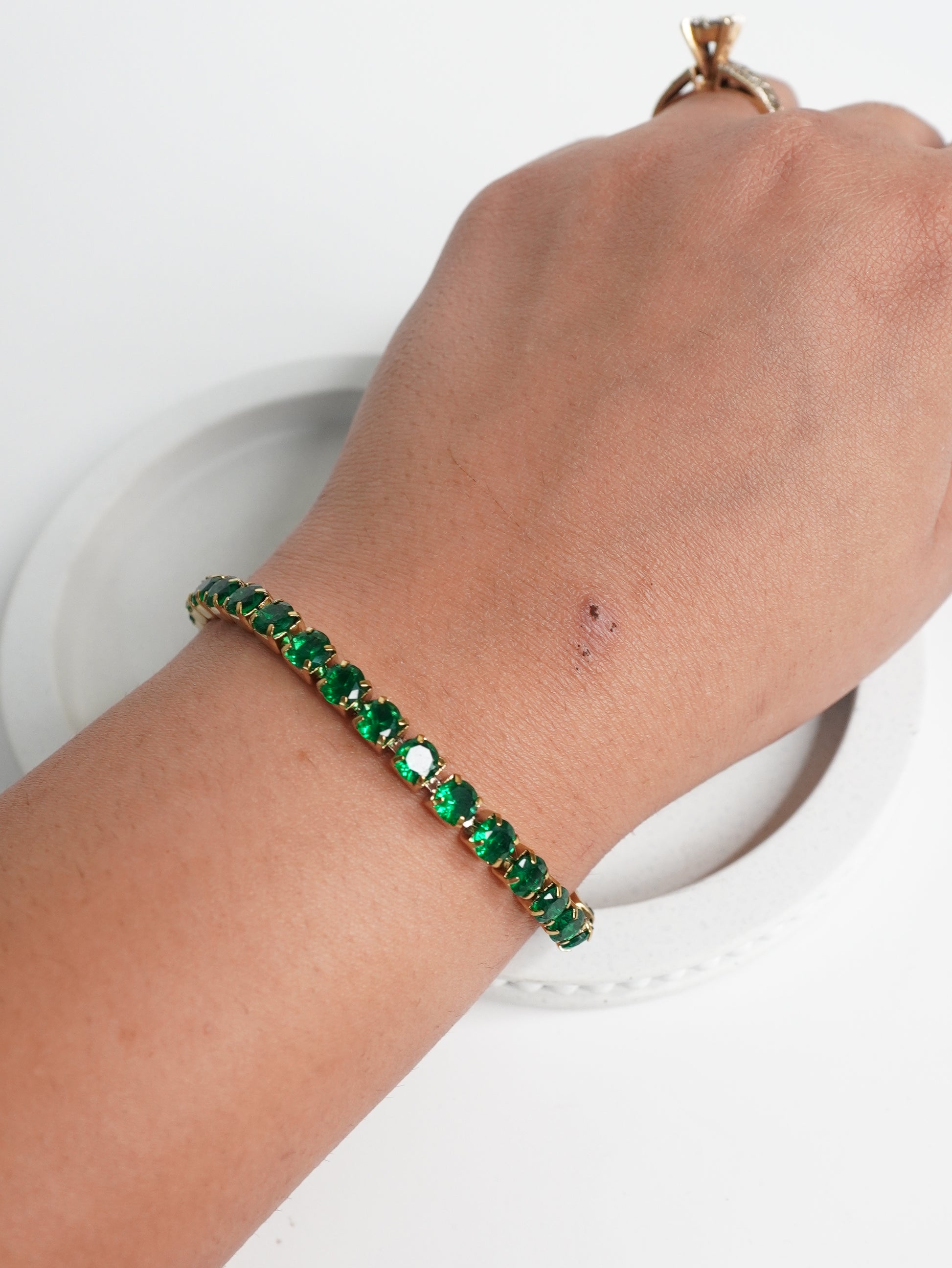 Step into timeless elegance with the Emerald Bloom Tennis Bracelet — where luxury meets everyday wearability. Each vivid green crystal, meticulously round-cut and set in 18K gold plating, radiates a captivating brilliance reminiscent of lush emerald gardens.