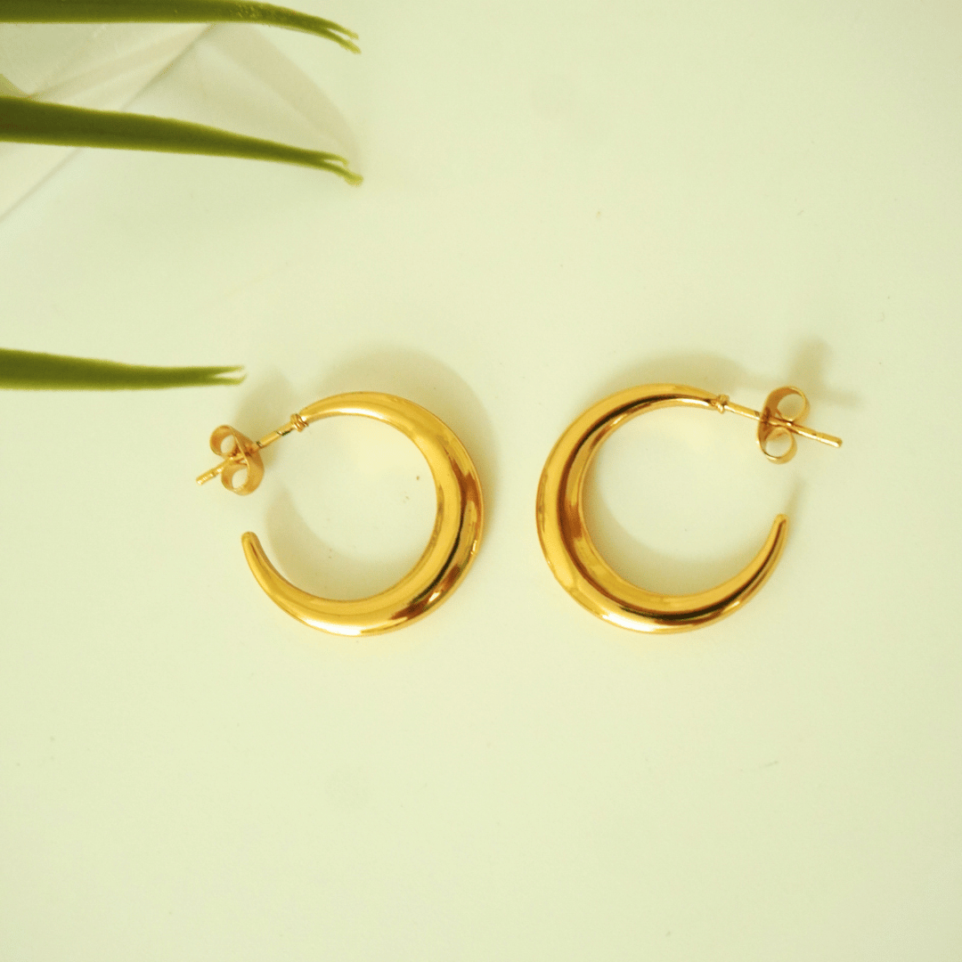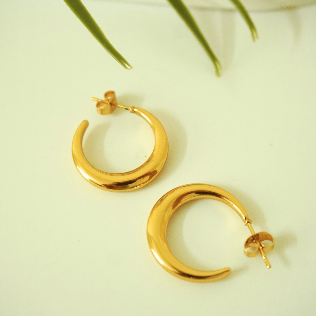 Add a celestial touch to your everyday style with our Luna Gold Crescent Hoop Earrings. Crafted from premium stainless steel and coated with luxurious 18K gold plating, these crescent-shaped hoops blend elegance with modern minimalism. Lightweight, anti-tarnish, and waterproof — perfect for all-day wear without compromising comfort or shine.