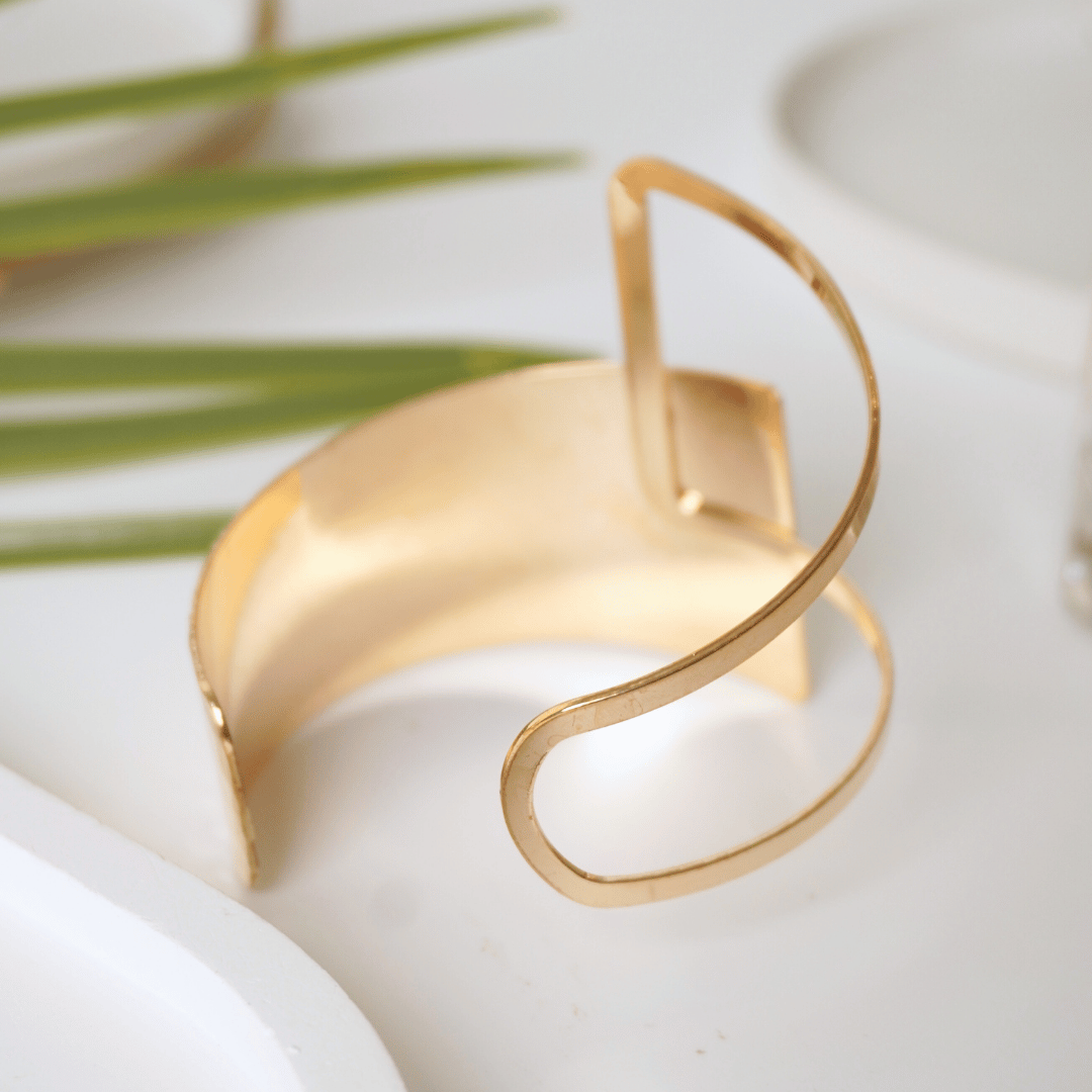 This striking cuff bracelet is crafted in solid brass and finished with a luxurious hammered texture that reflects light beautifully. Its sculptural design, featuring sleek geometric lines, adds a touch of high-fashion sophistication to any look.
