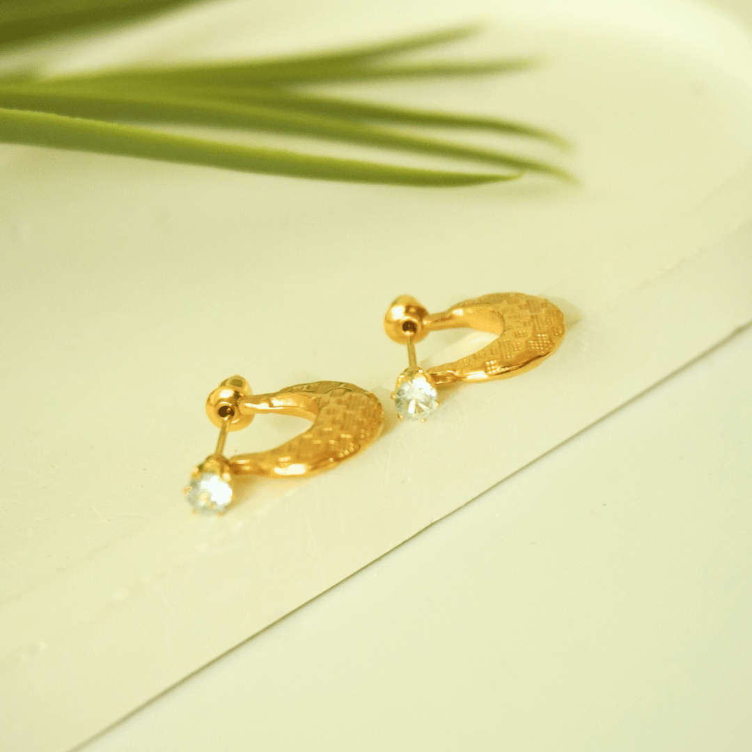 Radiate timeless elegance with the Solara Textured Crescent Drop Earrings. Featuring a delicately textured gold crescent paired with a brilliant crystal drop, these earrings blend modern design with a hint of vintage charm.