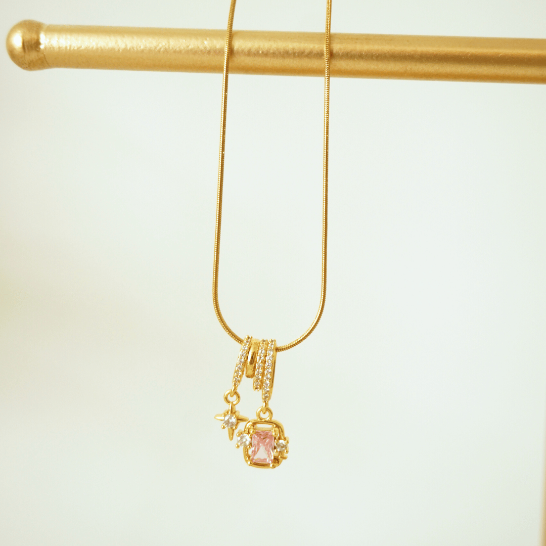 Elevate your style with the Stardust Blush Pendant Necklace, a perfect blend of elegance and charm. Crafted from premium stainless steel with luxurious 18K gold plating, this necklace features two dazzling charms — a sparkling starburst adorned with cubic zirconia, and a blush-pink cushion-cut stone framed with delicate crystal accents. The snake chain and pavé-set triple hoop detail make it a true statement piece that works beautifully for day or night.